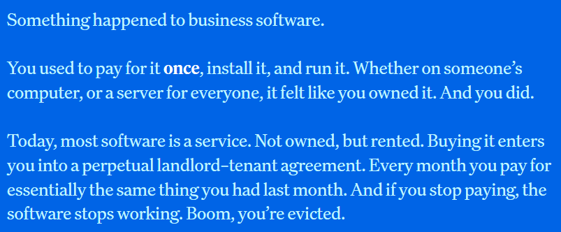 The metaphor of the landlord-tenant grounds the story into something everyone can relate to. Everyone understands what it’s like to have a bad landlord and Once compares it to the current Saas industry of monthly recurring subscription revenue.