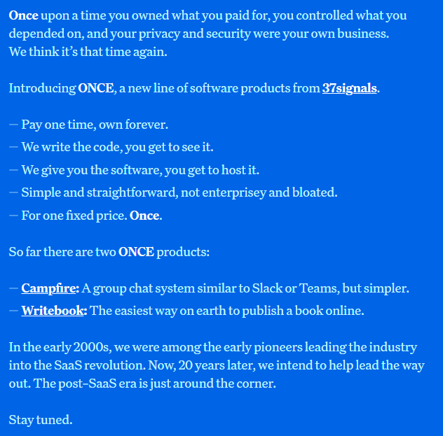 Once is a line of Saas Products by 37Signals. A software company created by Jason Fried, Carlos Segura, and Ernest Kim.